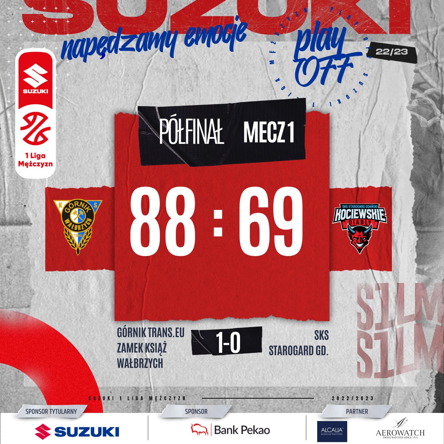 Pierwszy mecz półfinałowej rywalizacji Górnika Trans.eu Zamek Książ z SKS dla biało-niebieskich. Podopieczni Marcina Radomskiego zwyciężyli 88:69, przewagę wypracowując w trzeciej kwarcie. Duży problem przyjezdnym sprawili podkoszowi wałbrzyszan.