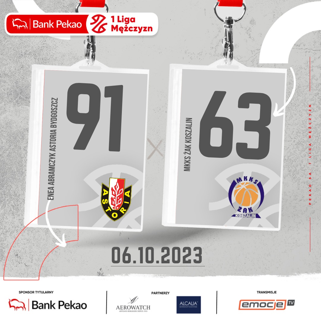 Wyraźna przewaga w nieparzystych kwartach zapewniła drużynie Enea Abramczyk Astoria Bydgoszcz wygraną w 3. kolejce Pekao S.A. 1 Ligi Mężczyzn. Zespół Krzysztofa Szubargi pokonał na własnym parkiecie MKKS Żak Koszalin 91:63. 17 punktów dla miejscowych uzyskał Filip Małgorzaciak.